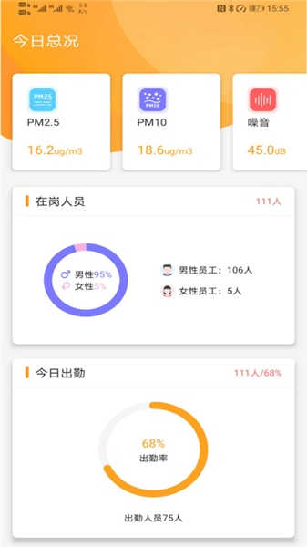 在岗人员实时统计,可分为男性员工和女性员工,方便用户进行管理;