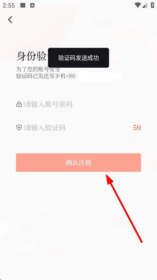4、在身份验证页面,按提示输入账号密码和手机收到的验证码,点击确认注销完成账号注销操作。