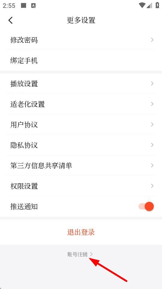 3、在更多设置页面,下滑找到并点击账号注销选项。