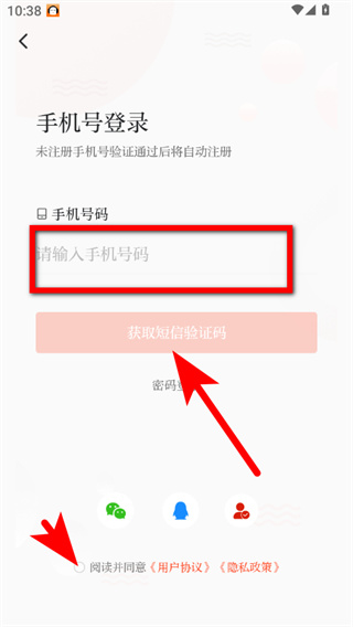 3、输入手机号码,勾选阅读并同意《用户协议》《隐私政策》后点击获取短信验证码。