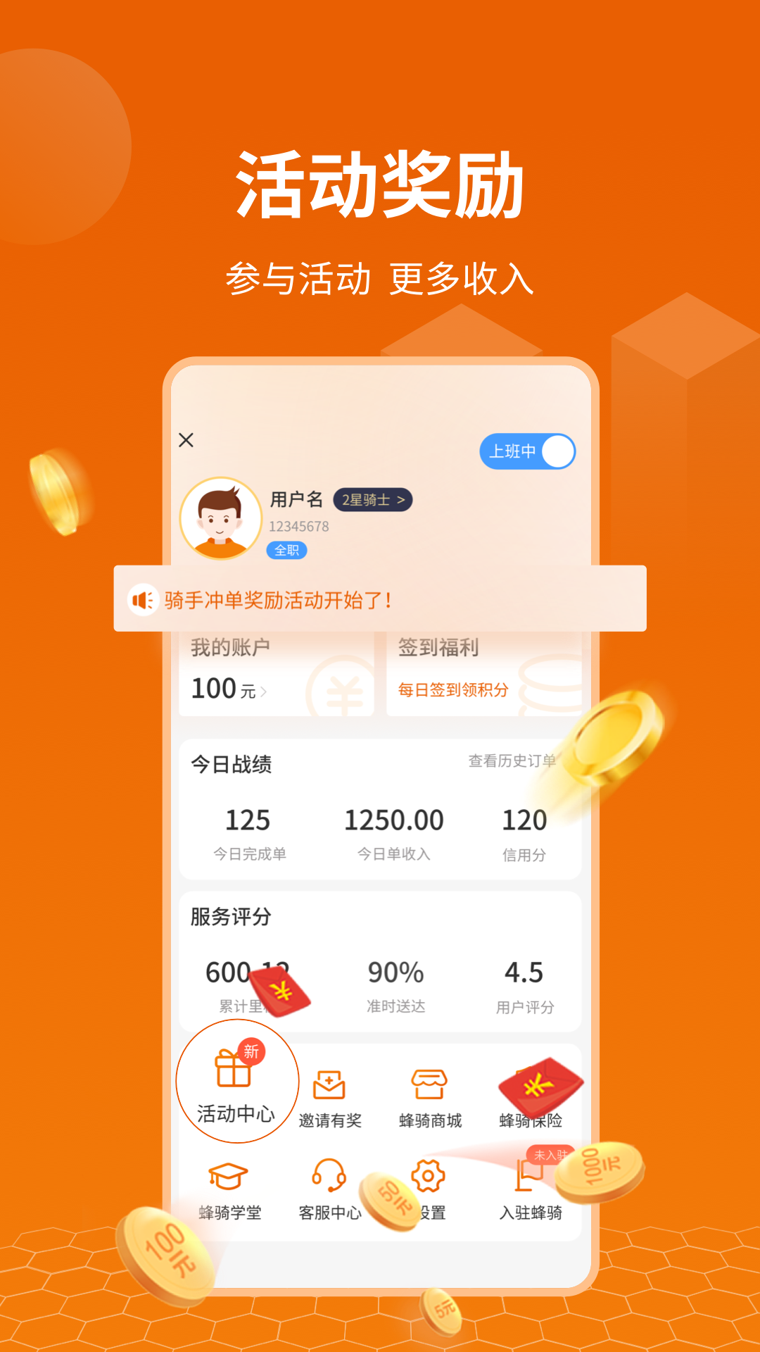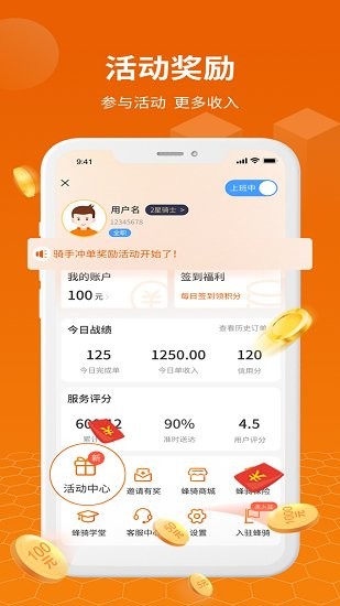 蜂骑快送骑手App是一款专业的跑腿接单工具,让你成为用户与商家的配送骑士,让你有机会月入过万,自己创业做老板,注册、认证即可开始接单服务,单单结算随时随地开始赚钱,自我掌控时间。