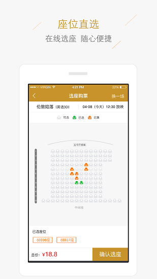 2、在订购影票的时候,直接在线选座,轻松选择最佳看电影座位;