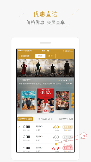 2、能够进行场次选座,根据空闲时间的安排,灵活选择场次预定影票;