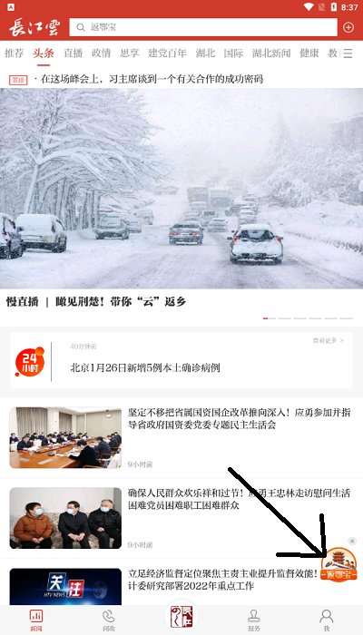 1、下载长江云app,进入推荐频道或头条频道。点击浮标栏“返鄂宝”