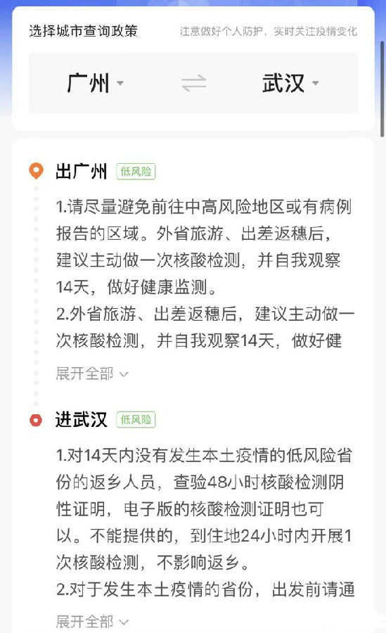 3、通过输入出发地、目的地即可轻松查询风险情况、出行政策等内容
