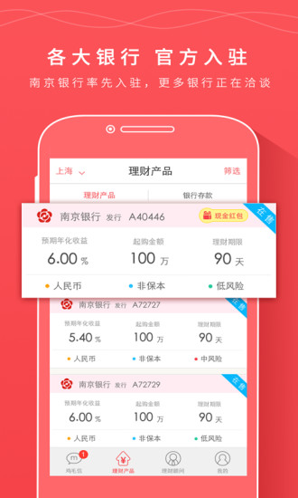 马上理财,是一个专业的投资理财平台。用户可以通过该平台了解在你附近有哪些银行正在发售理财产品,他们的预期年化收益是多少,起购金额是多少,理财期限是多久。你甚至可以随时随地预约银行理财经理,免排队,时时良机在握。是理财必备的神器。