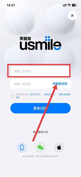 1、打开笑容加App,在登录页面,点击其他登录方式。