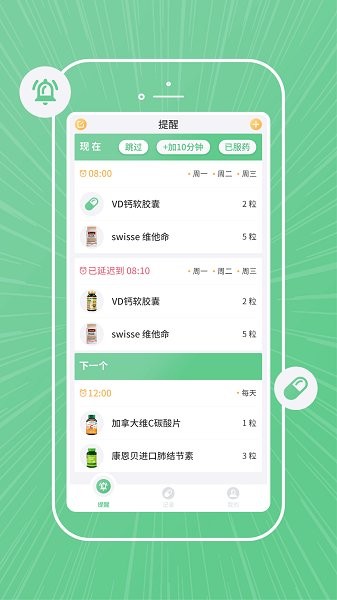 4、怕忘模式:如果用户操作手机会继续提醒用户按时服药;