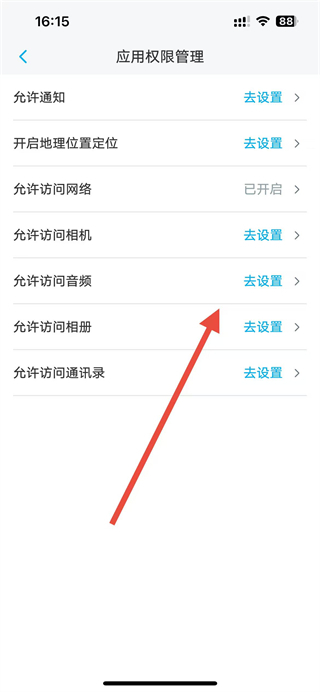 4、在该页面可看到各类权限,点击对应权限右侧的去设置,进入手机系统调整权限。