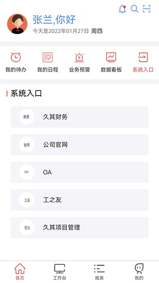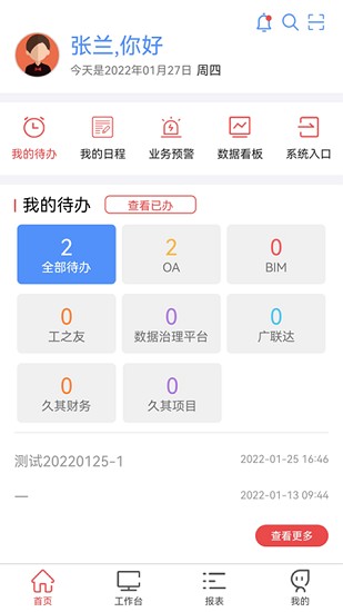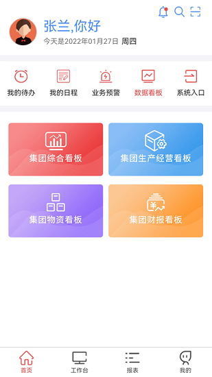 本应用主要包含四个功能:待办集成、日程管理、报表管理、看板。