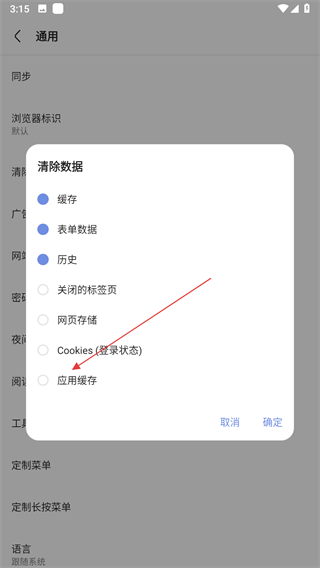 5、选择缓存等需要清理的选项,然后点击确定按钮。