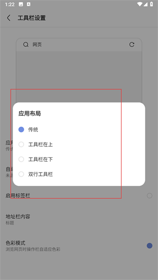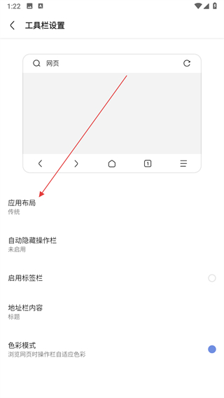 5、在工具栏设置页面点击应用布局选项,弹出菜单。