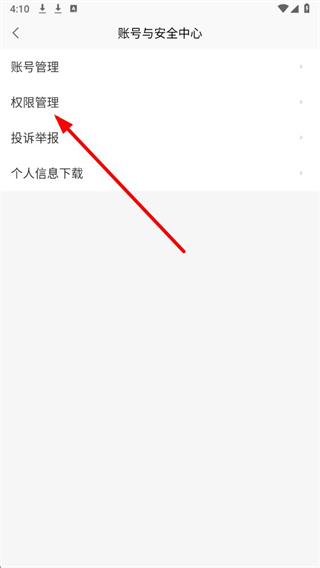 4、在账号与安全中心页面,点击权限管理选项,进入权限管理页面。