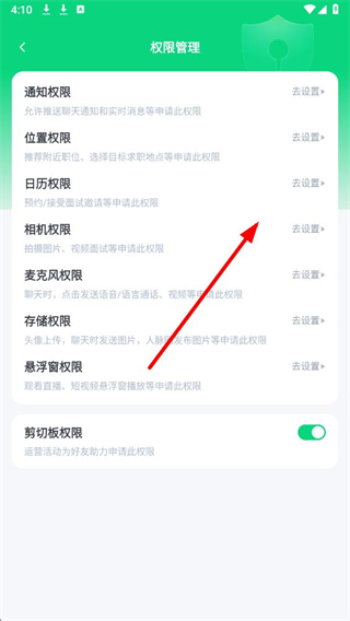 5、在权限管理页面,点击对应选项的去设置区域进行管理。