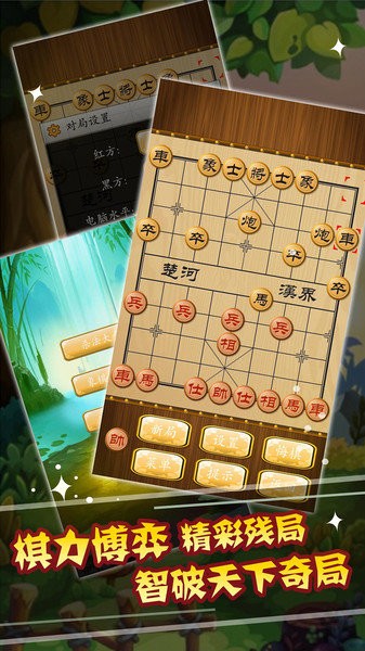 象棋,又称中国象棋。在中国有着悠久的历史,属于二人对抗性游戏的一种,由于用具简单,趣味性强,成为流行极为广泛的棋艺活动。有了这款象棋游戏,你无需棋具、无需联网,只要在手机上轻轻一点就能随时随地的来上一局,多种游戏模式,完善的电脑ai,多变的开局,不管是老手还是新手,这个游戏都不会让你们失望的。