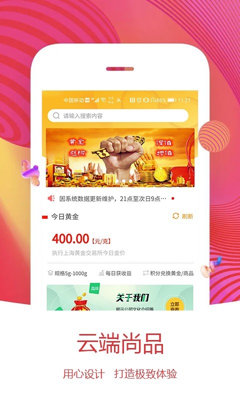 云端尚品,专业的黄金工艺品商城软件,在这里你可以轻松的寻找到自己喜欢的工艺品进行购买下单,软件精选优质店面商家提供产品供货,物美价廉质量有保障,有需要的消费者可以下载使用!