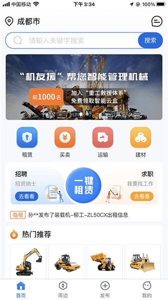 秉持机友援,助机友的创办理念,是致力于打造实现周边一键租赁、买卖、维修、招聘求职、设备管理、项目与机友互联互通和重工救援科学调度为一体的一站式综合服务平台。提供机械租赁、机械买卖、位置服务、轨迹回放等功能。