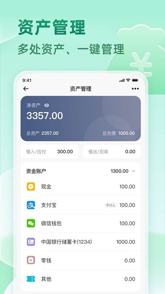 资产管理:资产账户、信贷账户、充值账户、债务等多种类型