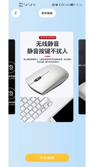 雕镜是一款拍照APP,其内置功能包括对产品进行拍摄,系统AI抠图,上传自己的LOGO,自主修改模板文案,自主生成海报套图,图片可下载长图,或者下载单图,进入雕镜APP新人可以免费获得使用次数,通过分享他人,可额外获得更多的使用次数。用途广泛,包含数码电子产品,小家电,工艺品等,方便快捷生成一套产品宣传海报。
