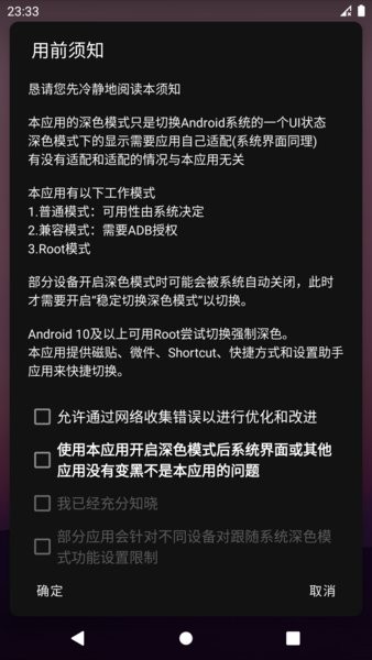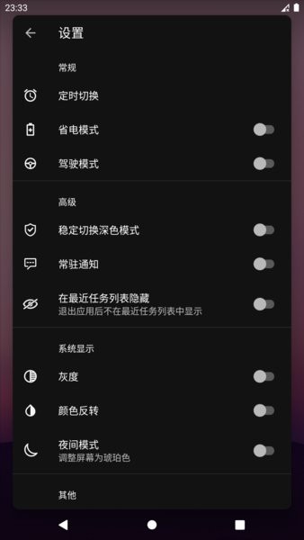 本应用的主要功能只是切换android系统的深色模式开关,而不是全局强制深色。