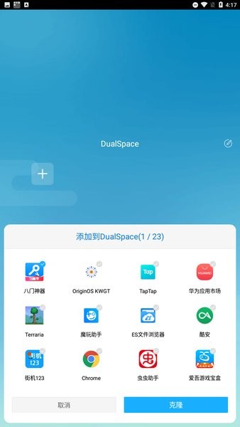 dualspace双开空间是能让 android 用户在一台设备上同时登陆同一应用两个不同的帐号的应用,它提供了一个独立并且自然的虚拟环境。并且用户还可以自定义个人的专属空间。同类型产品中率先兼容android p(9.0)的应用。如果您发现竞品闪退或者运行异常,请使用dualspace。我们可以保证在android p上的稳定性。