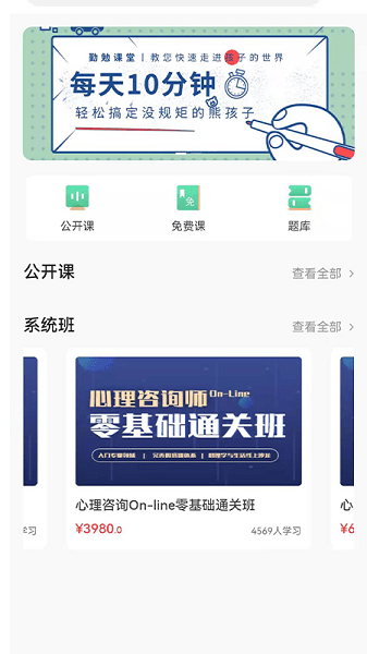 勤勉课堂安卓版提供多项培训课程的一个线上学习平台,详细的课程分类可以帮助你快速搜索到自己想要的课程。视频网课、习题练习等一应俱全,公开课、免费课、系统班教学任你选择,详情功能可以来了解更多。