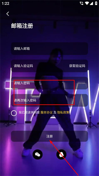 3、设置密码,并再次输入确认密码,点击注册即可完成账号注册。