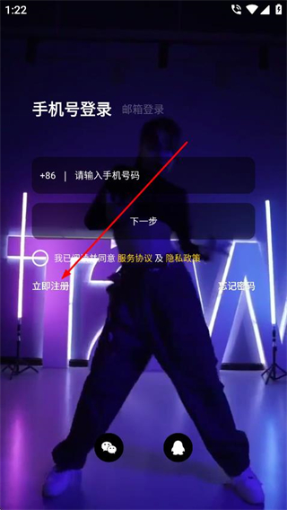 1、打开有心跳舞蹈app,在登录页面,找到并点击立即注册选项。
