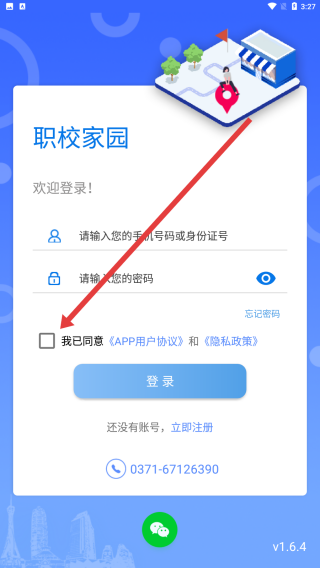 2、在职校家园登录页面中,首先点击勾选我已同意按钮后开始操作。