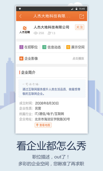 《人杰招聘》手机客户端(求职版),是结合主流移动互联网技术打造的全新互动式网络招聘服务应用,旨在构建人企直接互 动的新形态招聘体系,为广大求职者提供多媒体简历、个人空间展示、动态信息发布、精准职位推荐、职位搜索、周边职位浏览、企业关注管理、在线音/视频沟通、职位申请实时反馈、悬赏求职等实用功能。