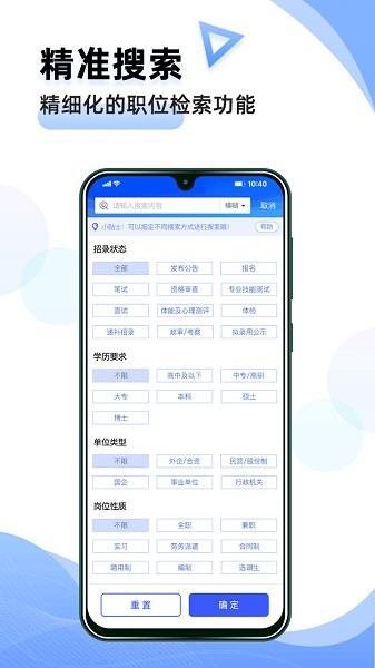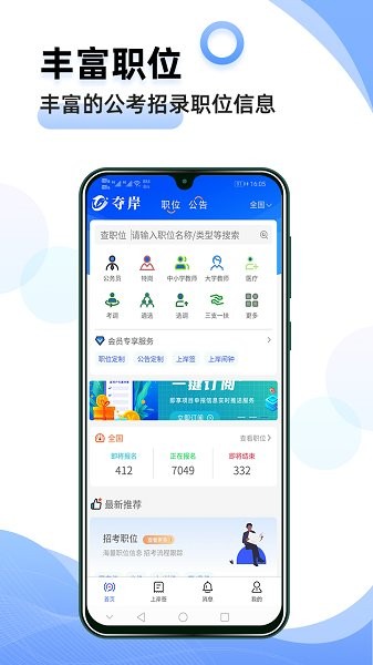 夺岸一专业的公务员及企事业单位招考信息资讯平台,实时收录全国各地公考招录信息,涵盖招考公告信息、职位信息、招录后续流程信息等,并提供精细化的职位检索功能和个性化的职位订阅功能,为广大的公考备考人员提供丰富的职位参考和招录全流程的信息资讯服务。