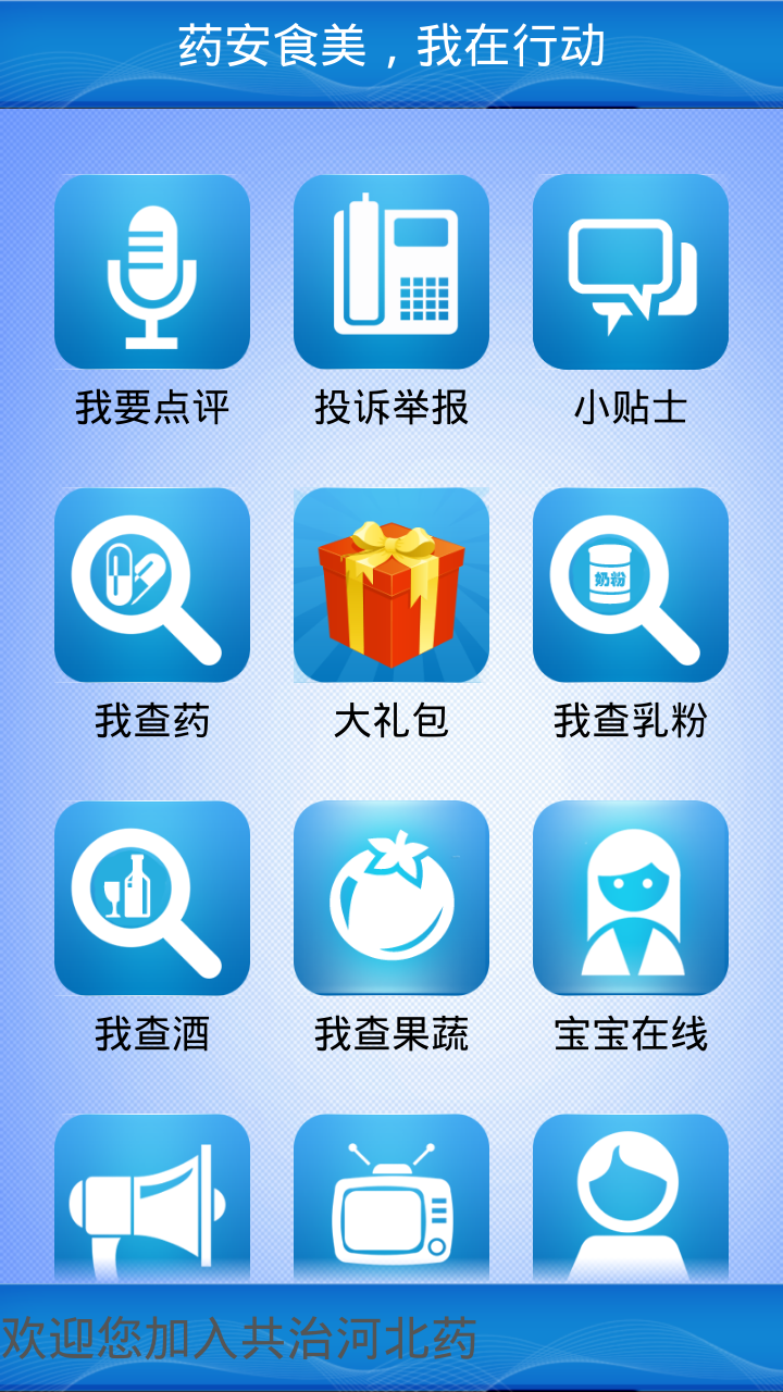 便民服务功能, 公众可以在购买药品前查询该药品哪家药店有售, 并通过该软件查验药品检验合格报告, 也可以对一些已经附了追溯码的配方乳粉、 酒类、 果蔬进行真伪查询和来源追溯, 同时可以通过该平台了解食品药品安全知识。