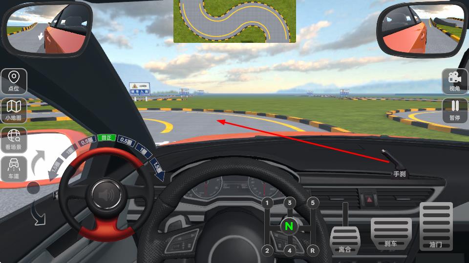 4、进入模拟驾驶界面,通过操作屏幕上的方向盘、离合、刹车、油门等虚拟控件,进行模拟驾驶练习。