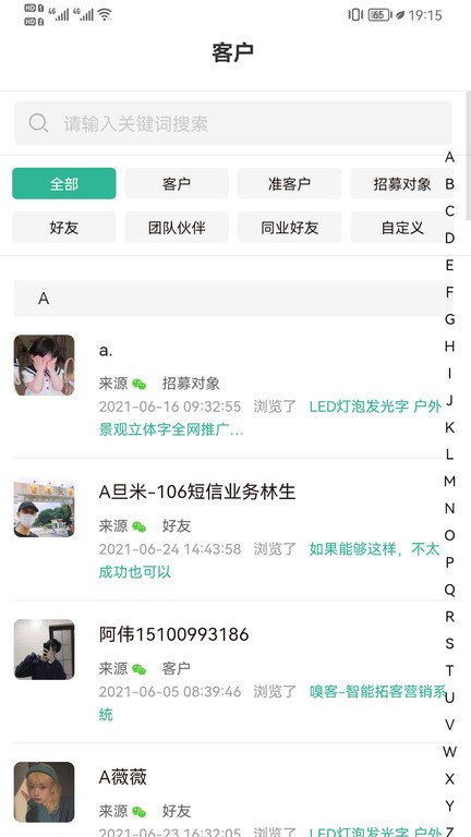 嗅客-智能拓客系统,可通过关键词搜索各省市客源数据,一键导入手机通讯录,自动匹配微信,私域流量营销实时洞察微信好友关注动态,轻松锁定意向客户,及时促进商机,成功帮助众多中小企业发展赢得了新的商机。