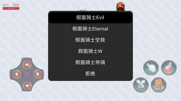是玩家自制的假面骑士战斗游戏,游戏当中联动了像素风格的fgo角色,在游戏中玩家可以通过对话来选择初始的假面骑士进行战斗,完成战斗任务,获得钥匙解锁下面的关卡。