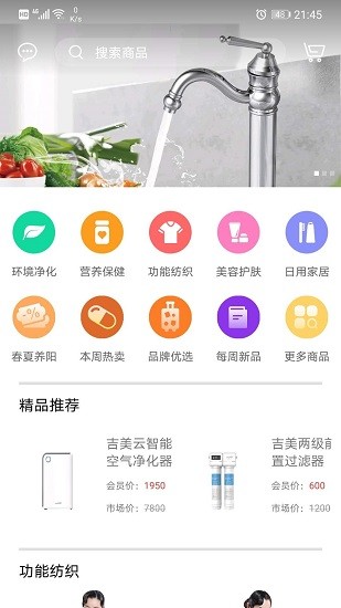 吉美商城app是一款能够买到超多生活类商品的手机购物软件,在这里用户们能够看到超多的日用类型的商品,环境净化、营养保健、功能纺织、美容护肤、日用家居、保健器械等等等等在这里全都能够找到,让用户们能够更好的找到让自己便捷和健康生活的产品,还可以帮助用户们在购物时省下不少钱。