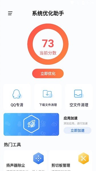 系统优化助手是一款功能多样、内容丰富的手机优化软件,全新简约的页面给用户极致的体验,提供清理优化措施功能,有效释放手机内存,优化系统,保障手机持续高效的运行,是用户优化手机的好助手。
