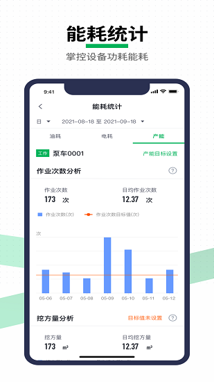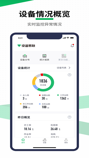 设备易联主要面向设备终端客户或设备管理员,可以随时随地查看设备的实时工况。同时,产品提供标准的BI报表服务,针对设备作业的场景,展示多维度的指标数据统计,包括开工统计(作业率、开工率、利用率、开机率和工时分布)、能耗分析(电能消耗、燃油消耗、产能分析)等,并且会定期推送周期报表供用户订阅查看。