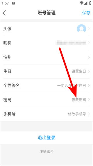 3、在账号管理页面,点击密码栏的修改密码,进入修改密码页面。