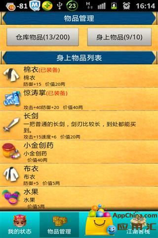 菜鸟闯江湖安卓内购修改版放置型RPG,无需传统RPG漫长的打怪升级过程,只需简单的购买装备、带上药品、配置武功,就能让你闯荡江湖,挑战武林十大门派,寻找传说中的神兵神甲,修炼绝世武功,快来试试看吧。