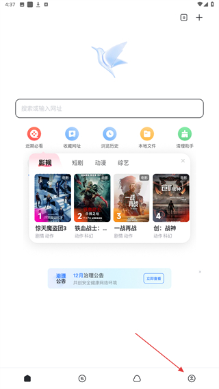 1、打开迅雷的应用App,在首页右下方点击人像的按钮。