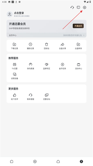 1、打开迅雷应用,点击页面右上角的设置图标,进入应用的设置功能页面。