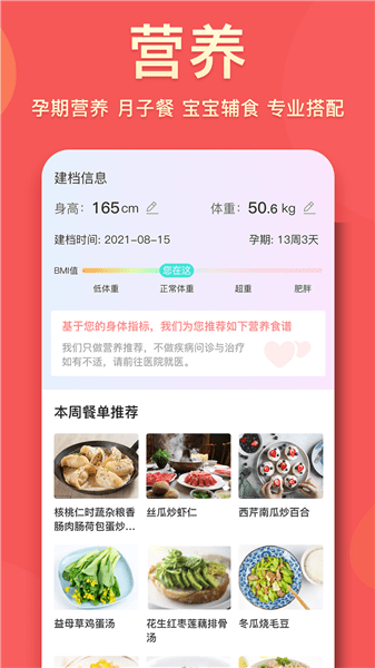 基于孕妈妈填写的建档信息,计算出科学的BMI(身体质量指数)值,针对不同 BMI值,推荐不同的营养食谱,真正做到千人千面,个性营养推荐,让孕妈妈及宝宝更健康;