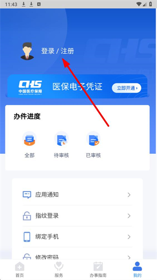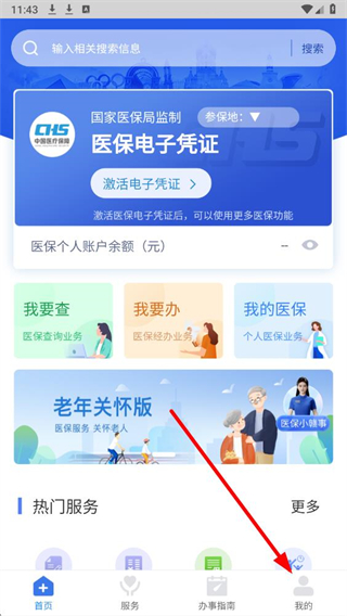 1、打开医保应用首页,点击底部导航栏右侧的我的,进入个人中心页面,开启账号操作流程。