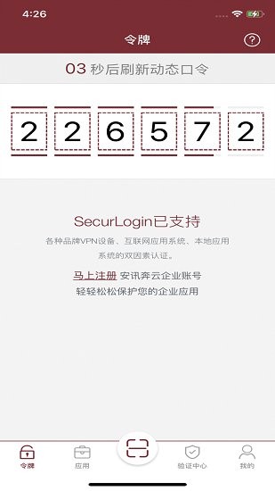 在应用内通过摄像头扫描云端网页上的二维码下载软件令牌,生成动态口令。用于用户登录企业应用时做二次认证。