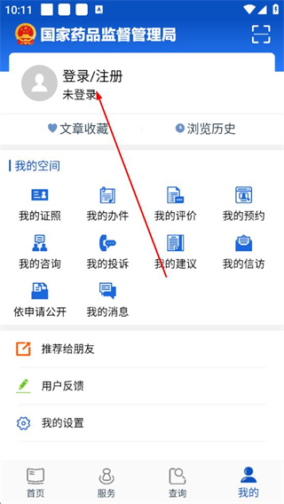 1、打开中国药品监管app,点击底部导航栏的我的选项。