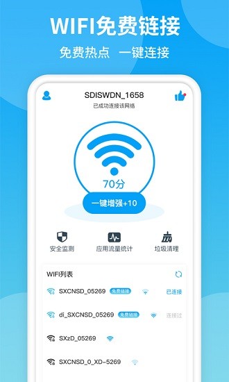 防蹭网wifi管家在这里你可以管理自己连接的wifi,线上可以免费连接多个wifi热点,走到哪里让你都能免费上网,同时还可以监测网络的安全,让你上网更加有保障。在这里还可以为网络进行优化提速,找到信号源强的位置,时刻显示网速等,欢迎有需要的朋友下载使用!