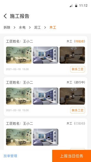 饰家智选工匠端app实现家装流程中的“拆除、水电工、泥工、木工”等角色入场施工跟进及相关进度质量汇报。