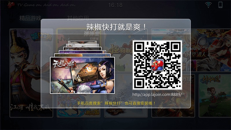 辣椒快打是深圳市天易联科技有限公司研发的电视版、手机版应用,该款APP能够无缝将手机游戏移植到电视上,用户只要下载该款应用就能将手机变身手柄,在电视上玩数万款手机游戏。