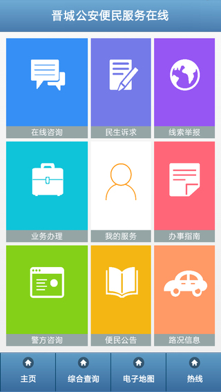 目前,晋城公安便民服务在线微信平台共设置了“警方资讯”、“警民互动”、“综合查询”3大板块12个栏目,通过文字、图片、语音等多种方式,对外发布最新警方资讯、警方提示及政策法规等。同时,网民也可以利用微信平台,直接进行在线咨询、线索举报、智能问答、车辆违章查询、驾驶人交通违法查询、身份证办理进度查询、公安通讯录查询等多项实用查询。